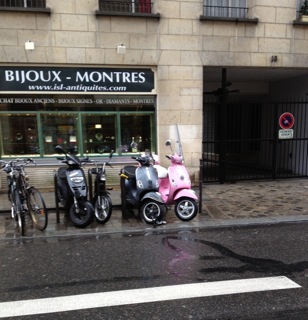 If you have read any of Cara Black’s Aimée Leduc novels, you know the significance of this pink Vespa that I photographed during my recent trip to Paris. AND I even spotted it on Ile St. Louis. Pink Vespa + Ile St. Louis = Aimée. It must be hers.