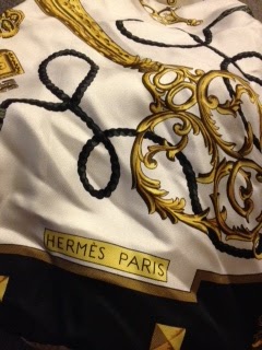 Aimée has a private detective/computer security business passed down to her by her grandfather. Her father was a police officer who was blown up by bad guys. Her godfather is one of the top dogs of the Paris police force. Her mom abandoned her when she was eight years old. Aimée dresses in vintage designer clothes she finds at the flea market. In the latest book, she wraps a Hermès scarf around her neck before going out. I have one, too, Aimée!! I found it for $5 at one of the local consignment shops.