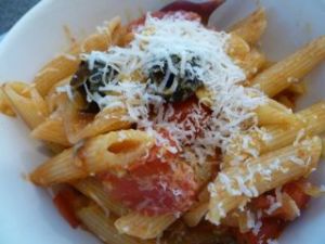 Ms. Sunée calls it Midnight Pasta #3:  Penne with Popped Tomatoes, Anchovies, and Onions.  It is simple to make and so good.  Très provençale, aussi!  Tant mieux.